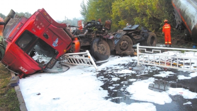 前天下午,延慶縣京藏高速西撥子環(huán)島橋旁,一滿載32噸柴油的油罐車失控側(cè)翻,柴油泄漏。延慶消防組織救援,將漏油稀釋和用土掩蓋,并將漏油處封堵運走剩油。文/京華時報記者常